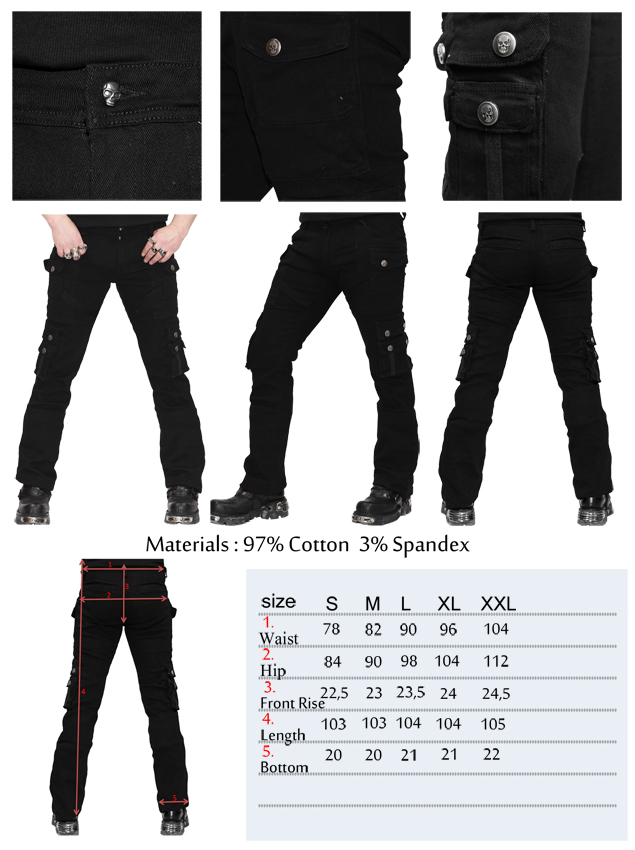 Commando Black Pantes är byxor från Restless ‘N’ Wild! Elastiskt tyg, två framfickor, två bakfickor med svarta dragkedjor och tre fickor på varje ben.
