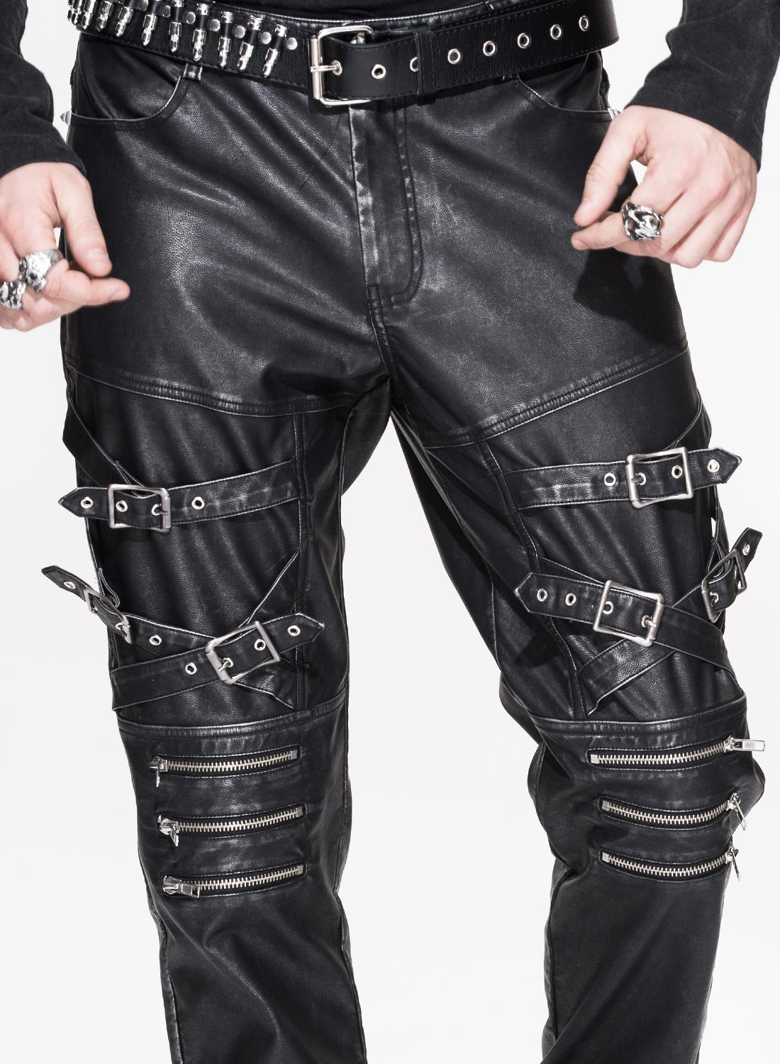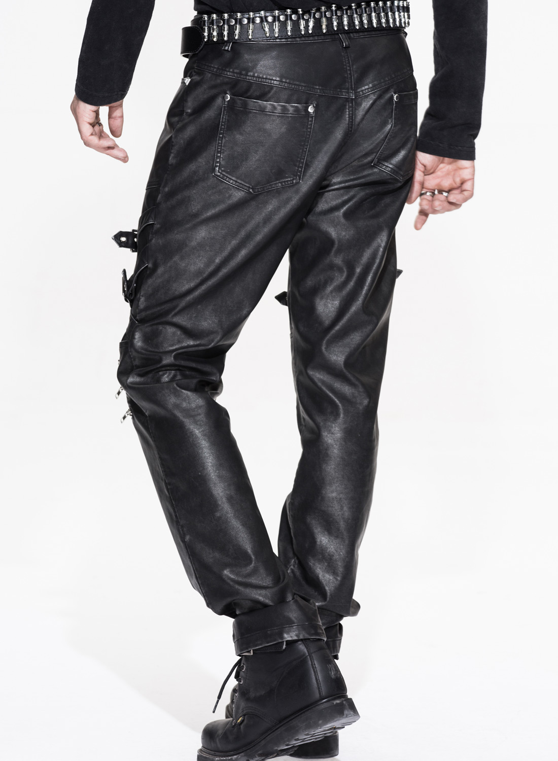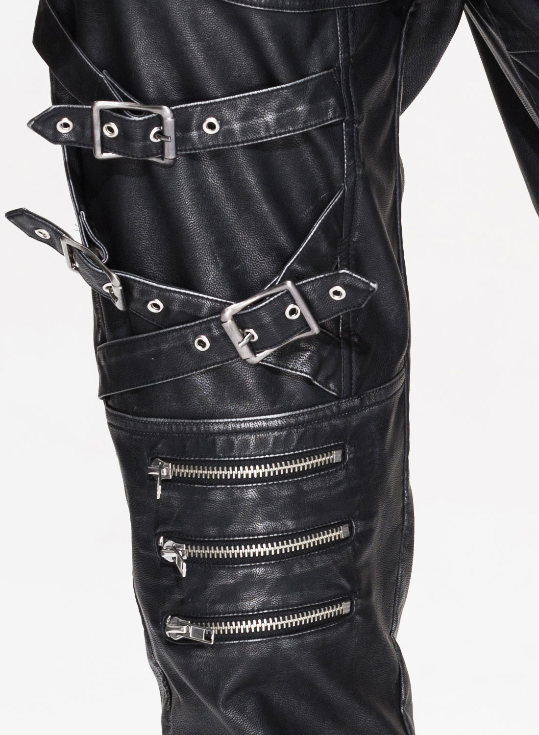 Syntetiskt läder i antracitfärgad stentvättad look med nitade fickor, knapp och dragkedja. Remmar och dragkedjor på benen.