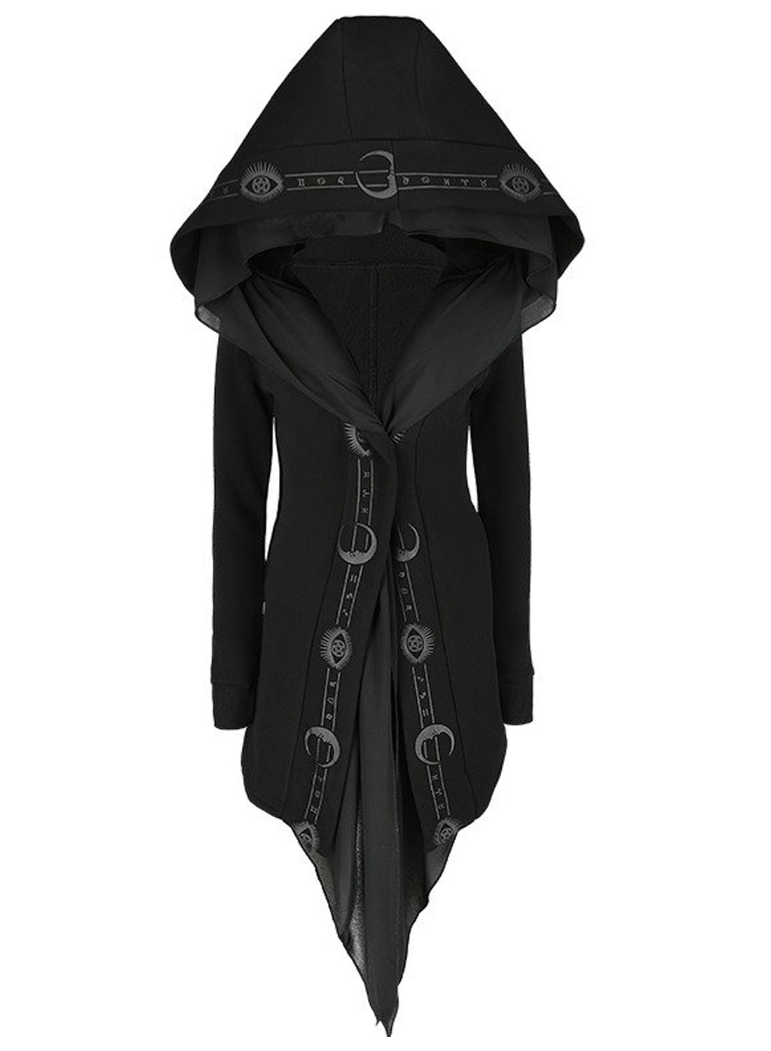 Restyle Fortune Teller Hoodie. Denna fenomenala gotiska hoodie från Restyle clothing är perfekt för din alternativa outfit. Lång och supervarm, gjord av tjock högkvalitativ bomull med en slöja sydd på luvtröjan i full längd för att skapa ännu mer mystik. De 2 knapparna ger dig en markerad midja. Den överdimensionerade huvan håller dig varm och torr under regniga och blåsiga dagar.