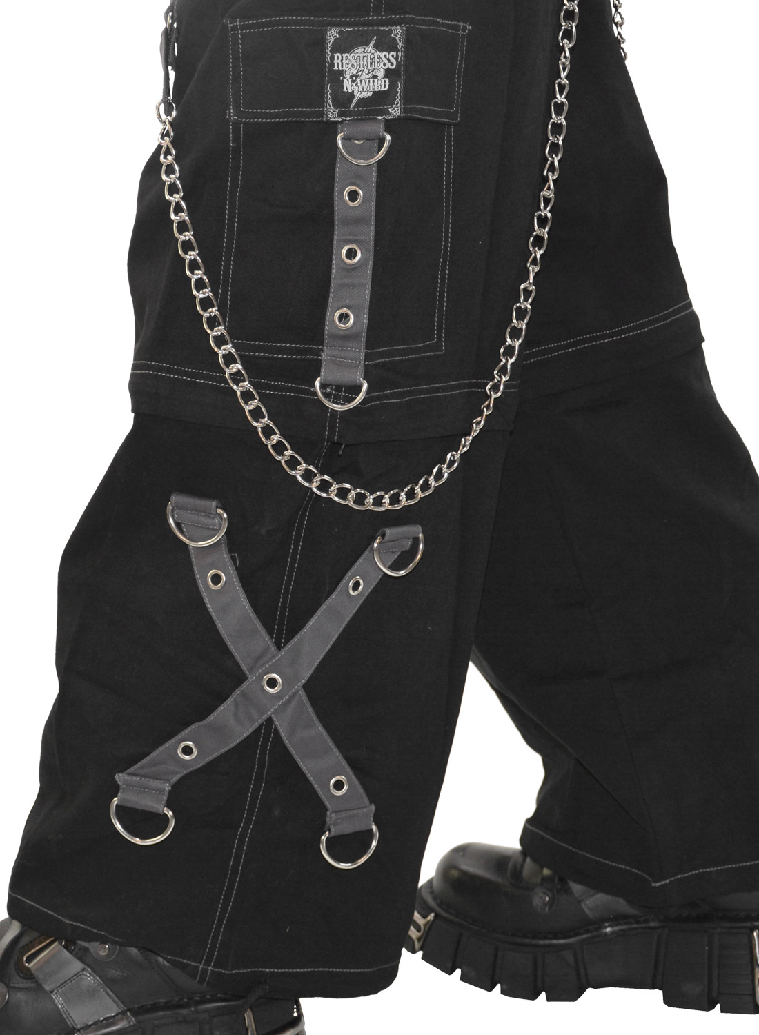 Med många fickor, nitar och avtagbara Kedjor och remmar. Byxbenen har en dragkedja så att byxorna kan göras om till shorts.
