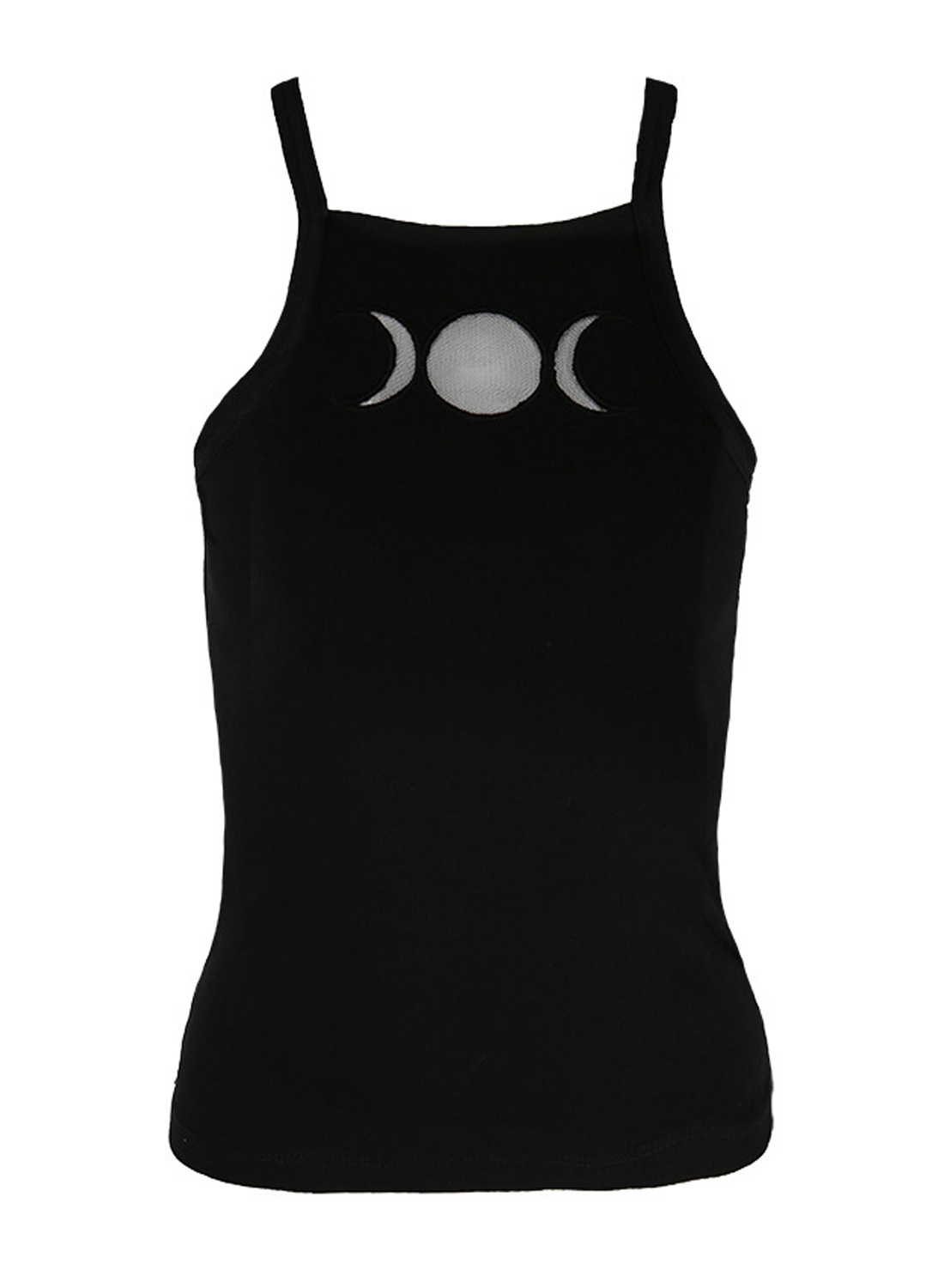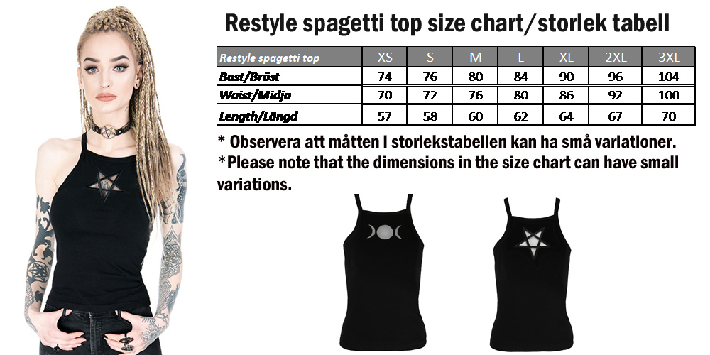 Tripel Goddess Black Top är ett snyggt, ockult linne från Restyle. Tight modell med öppna axlar – utskuren tripel måne över bysten i genomskinligt mesh-tyg.